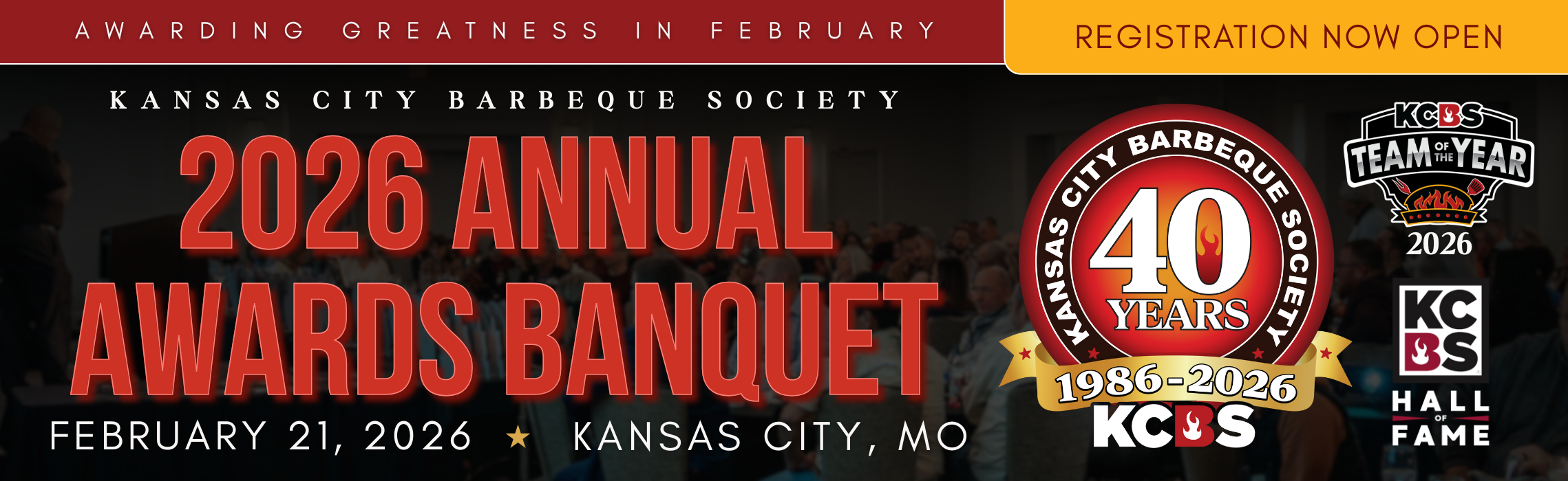Celebrate BBQ’s finest achievements with friends and family at the 2026 KCBS Annual Awards Banquet on February 21st, 2026, at the Kansas City Marriott Country Club Plaza! Reserve your seat, dine with BBQ’s best, and relive the season’s top moments. We’ll honor the Teams of the Year, recognize Perfect Perfect winners, celebrate our prestigious KCBS Hall of Fame Inductees, highlight Reps and outstanding CBJs, and pay tribute to the esteemed Gary and Carolyn Wells Ambassador awardees.