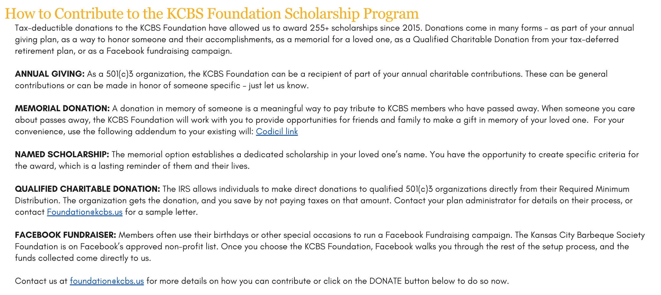 To support the KCBS Foundation's scholarship fund or to honor the memory of a beloved member through the establishment of a named scholarship, please reach out to philanthropy@kcbs.us or call the office directly at 1-800-963-5227.